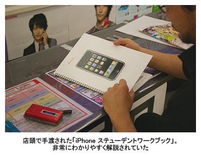 iPhoneの契約に出向き、事前知識の補完の意味も含めていろいろ質問していたら、店舗のスタッフから「iPhone ステューデントワークブック」という冊子を渡された。店頭スタッフの教育用ガイドブックのようで、ありがちな質問や販促テクニックがわかりやすく解説してあった。iPhoneの説明書は非常にシンプルなので、こちらのガイドブックが欲しいところだ。