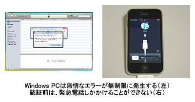 早速持ち帰って、箱を開く。ケースはコンパクトだが、アップルらしくセンスがいい。端末を出したら、まずは付属のピンを使って本体上面からSIMカードを装着。このSIMカードはiPhone専用で、ほかのキャリアはもちろん、ソフトバンクの端末に入れても動作しない。続けて、最新の「iTunes 7.7」をインストールしたメインマシンに接続。感激の一瞬かと思ったら、「AppleMobileDeviceHelperは動作を停止しました」というエラーダイアログ開き、困ってしまった。PCに問題があるのかと思い、別のPCで試してもまったく同じ症状。アクティベーションをしなければ、何もできないので冷や汗ものだったが、強引にいじっていたら、なんとか認証は成功した。