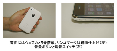 iPhone 3Gの液晶サイズは3.5インチ(480×320ドット)と、ケータイとしてはダントツに大きく見やすい。薄さは12.3mmとスリムで、重さは133gと平均レベル。ただし、幅が62.1mmあるので、一般的なケータイよりも大きく感じる。背面は樹脂製だが、チープさはなく、持っていて楽しくなるデザインだ。