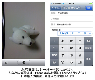 文字の入力はソフトウェアキーボードで行うが、フルキーボードはボタンが小さく入力ミスを起こしやすい。日本語用のインターフェイスも用意され、従来のケータイと同じ入力も可能だ。一番困ったのが、コピー&ペーストができない点。メールやウェブの検索時に非常に手間取る。また、日本語入力する際に動作が遅くなるのが気になった。動作は全体的にスムーズだが、文字変換時には数秒待たされることもあり、肝心の変換候補も微妙に精度が悪い。予測変換をオフにすることができないのも不便だ。