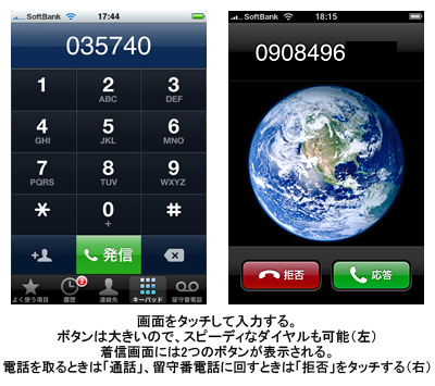 タッチパネルなので、従来の電話のように手探りで発着信するのは難しいが、シンプルなインターフェイスで使い方に迷うことはない。また、電話中に、メールの作成やウェブの閲覧など、ほかの操作が行えるのも大きな魅力。iPhoneのブラウザ「Safari」はフォントが美しく、画面も大きいため、ウェブ閲覧は快適だ。