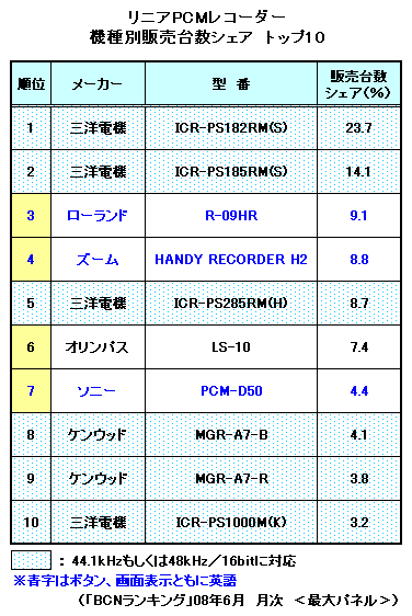 6月のトップ10に戻ろう。3位はローランドが08年3月に発売した「R-09HR」でシェア9.1%。サイズは定期入れ程度。付属する小型リモコンで、離れた場所からも操作できる。同価格は3万8900円。4位は07年8月発売のズームの「HANDY RECORDER H2」でシェア8.8%。こちらもサイズは定期入れ程度で、やや丸みを帯びたデザインだ。ウィンド・スクリーンやスタンドなどのアイテムを付属する。同価格は2万2200円。2機種ともに96kHz/24bitの高音質録音に対応する。