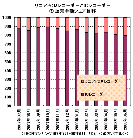 ICレコーダー全体に占めるリニアPCMレコーダーの割合もみてみよう。ちょうど1年前の07年7月、販売金額の割合は12.3%だった。しかし徐々に拡大し、08年6月には20.5%と、ついに2割を超えた。一方、販売台数シェアも07年7月に5.8%だったのが、1年後の08年6月には11.1%でおよそ1割を占めるまでに成長。金額・台数ともにリニアPCMレコーダーは確実にシェアを拡大しつつある。