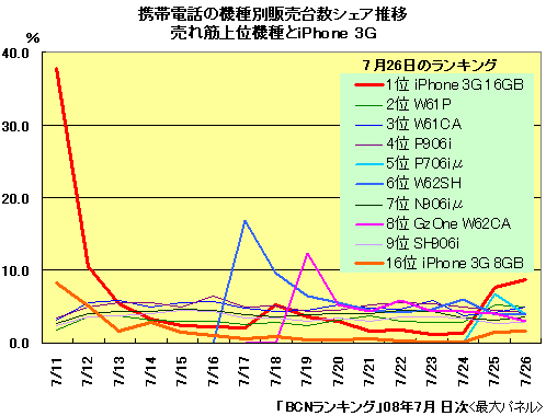 発売日の7月11日には、16GBと8GBモデル合わせた販売台数シェアの速報値で携帯電話の44.9%のを占めたiPhone 3Gだが、翌12日には同7.0%に下落。以降品切れが続き、シェアも大幅に下がっていた。しかし、発売から1週間が経過した18日の金曜日、若干の入荷があったとみられ、16GBモデルが5.3%で2位に浮上した。