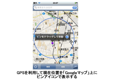 標準搭載アプリで、他に使用頻度が高そうなものでは「マップ」があげられる。マップとは、Googleマップ上に現在位置を表示させることができる機能のこと。位置情報の把握には、GPSとWi-Fiネットワークを利用するが、GPSが利用できる環境では、かなり正確に現在位置に赤いピンが表示される。GPSが利用できない環境では、Wi-Fiネットワークを使っておおよその位置を表示するが、その場合は現在地の範囲を絞り込む円がやや大きく、ピンの色も青になる。「Safari」同様に、タップして地図を拡大表示させ、あとは自分で現在位置を探すといった使い方も可能だ。