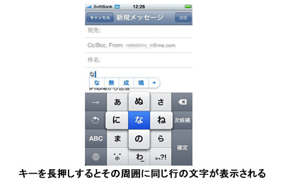 テンキーで日本語入力する際には、例えば、一般的なケータイと同じように「な」を3回タップすると「ぬ」が入力できる。また、キーを長押しすると、その周囲に同じ行の文字が表示されるので、その状態で指をスライドさせることでも文字入力できる。