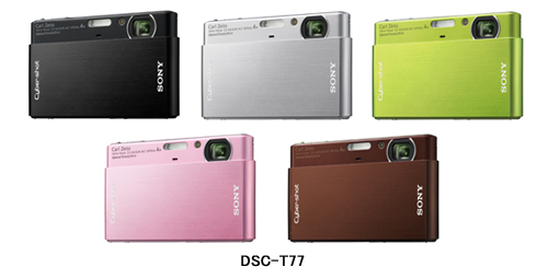 「DSC-T77」は、光学手ブレ補正機能を搭載したカメラとしては世界最薄13.9mmを実現。きょう体にはステンレスを採用し、レンズカバーで本体を側面まで覆うデザイン。3.0型ワイドの液晶モニタを搭載する。サイズは幅93.6×高さ57.2×厚さ15.0mm、厚さは最薄部が13.9mm、重さは約126g。カラーはブラック、シルバー、グリーン、ピンク、ブラウンの5色。