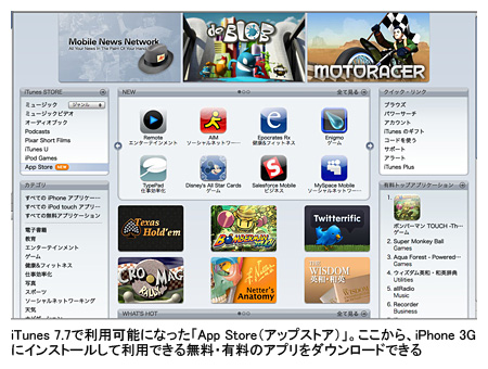 まず、App Storeを利用するためには、最新のiTunes(8月5日時点の最新バージョンは7.7.1)をPCにインストールしておく必要がある。iTunesでiPhone 3Gの認証を行い、iTunes Storeのアカウントを有効にしておけば、あとはiPhone 3G単体でもアプリの購入は可能だ。