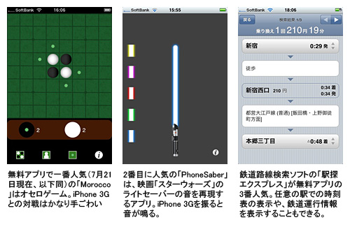 実は、日本語の無料アプリだけでもかなりの数があって、便利なものやユニークなものも数多い。また、有料アプリでは、iPhone 3Gが搭載する加速度センサーや、タッチスクリーンの面白さを生かしたゲームが楽しめるアプリなどもそろっている。有料アプリの金額は、115円から2000円を超えるものまでさまざま。しかし、月額利用料がかかるものは少ないので、ケータイのアプリよりもおトクに利用できるものが多い。