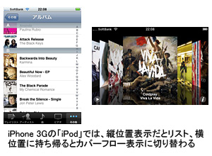 iPhone 3Gが搭載するもう1つのメイン機能。それが「iPod」だ。iPodシリーズを使ったことのある人なら、まったく違和感なく使えるインターフェイスに仕上がっている。さらに、内蔵する傾きセンサーを利用して、iPhone 3Gを縦位置で持てばテキストベースのメニュー表示、横位置で持てばアルバムのアートワークをめくるカバーフロー表示にすばやく切り替わるギミックは、実によくできている。まもなくiPodシリーズがリニューアルされ、touch以外の他のiPodにも横長画面とこの機能が搭載されるという噂があるが、ぜひ期待したいところである。それくらい多くのiPhone 3Gユーザーが気に入っている操作感と言える。