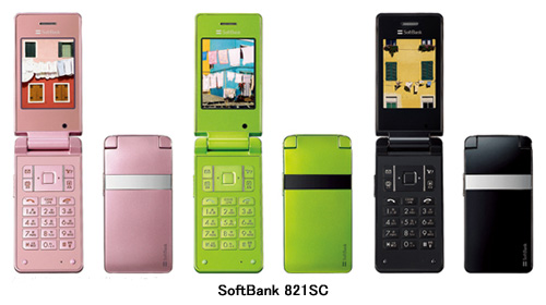「SoftBank 821SC」は、2.4型有機ELディスプレイを備えたワンセグ対応携帯電話。丸みを帯びたコンパクトなボディが特徴で、既に発売しているホワイト、シルバー、パープル、レッド、ピンクの5色に、クールピンク、ライムグリーン、ブラックの3色を新たに追加した。電話番号やメールアドレスをそのまま海外で使えるサービス「世界対応ケータイ」には未対応。サイズは幅49×高さ99.5×厚さ16.7mm、重さは約120g。実質負担額は0円。