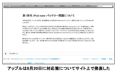 なお、事故が発生しているのは初代iPod nanoのみ。同社が把握している事故発生率は販売台数の0.001%未満で、重大な人的被害や物的損害は報告されていないという。