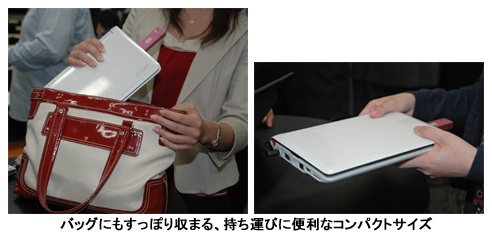 HDDの容量は120GBでメモリは1GB。CPUにはモバイルネット端末向け超小型 CPUのインテル Atom N270(1.6Ghz)を搭載する。OSはWindows XP Home Edition(SP3)。価格はオープンで、実勢価格は5万4800円前後の見込み。