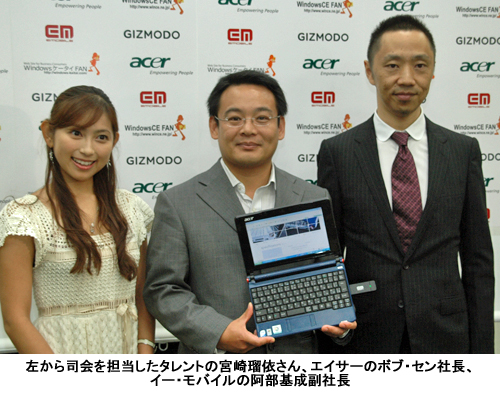 日本エイサーのボブ・セン社長は、イー・モバイルの通信サービス、スーパーライトデータプラン「にねんMAX」に加入する条件で「Aspire one」を9980円で販売する期間限定のキャンペーンを実施することを発表。「『Aspire one』とイー・モバイルのデータ通信端末『D11LC』とのバンドルによって、価格面でも機能面でも多くのユーザーに満足してもらえるだろう」と語った。