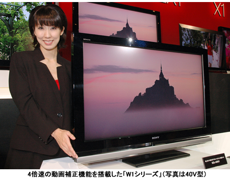 「W1シリーズ」は世界初の4倍速の動画補正機能を搭載した機種。動画補正機能は1秒間に60コマの映像を補完することで、液晶テレビの弱点である残像感を低減する機能。ソニーではコマ数を2倍にする従来の120コマから4倍の240コマに増やすことで、残像感をほぼなくしたという。画像処理回路は「ブラビアエンジン2」を搭載する。
