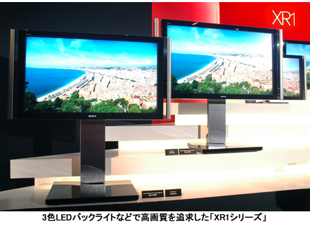 画質を追求したのが「XR1シリーズ」。バックライトに赤、緑、青の3色LEDを採用。色の再現性を拡大したほか、各色のLEDをブロック単位で部分制御することで、100万:1以上の「有機EL並みで測定限界以上の高コントラスト」(吉川孝雄・テレビ事業本部FTV事業部門部門長)を実現した。また、バックライトの制御により不要な発光を抑えたことで低消費電力化も図った。