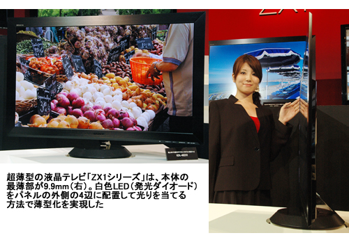 超薄型テレビ「ZX1シリーズ」は、本体の最薄部が9.9mm、重さは12.2kg。バックライトに白色LED(発光ダイオード)を採用し、パネルの外側の4辺に配置して、画面を均一に光らせるようにすることで、薄型・軽量化を図った。