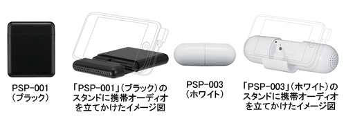 「PSP-001」は、カードサイズのポータブルスピーカー。本体をスライドさせてできる溝に付属スタンドを設置し、携帯オーディオを立てかけて使用する。スタンドは携帯オーディオの種類に合わせて3種類揃える。電源は本体をスライドすれば自動的に入る仕組み。