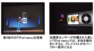 ポケットから新しい「iPod nano」を取り出したジョブズCEOは、「iPod史上もっとも薄いiPod。画面もとても美しい」とその薄さを強調し、アルバムアートのカバーフロー表示や、横位置での写真表示をデモしてみせた。
