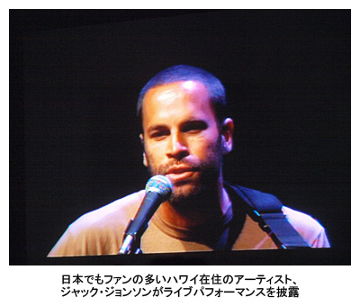 最後に、アップルの音楽関係イベントでは恒例となっている、有名アーティストのライブパフォーマンス。今回は、iTunesストアでもっとも多くダウンロードされているアーティストという紹介で、ジャック・ジョンソンがステージに登場。