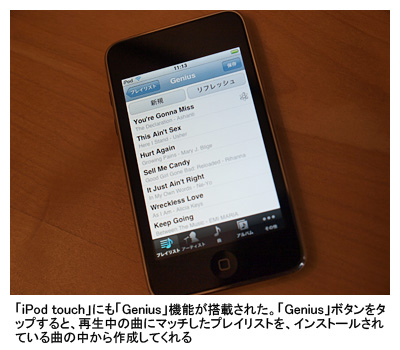 iTunes 8の「Genius」ボタンを1回クリックすると、HDDに保存してあるiTunesのライブラリの中から曲をサーチし、さらにもう1回クリックすると、今度はiTunesストアの中からもマッチした曲をサーチして、iTunes 8の右ペインに表示する。「Genius」は学習機能を備えていて、使えば使うほど、「マッチした曲」の精度が上がっていくという。