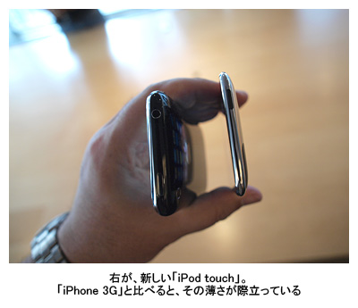 続いて、第2世代の「iPod touch」を発表した。今度の「iPod touch」には、ボリュームコントロールボタンとスピーカーが搭載された。もちろん、新しいnanoと同様に、加速度センサーと「Genius」機能も搭載されている。そして、極限までボディの厚みを抑えたデザインになった。