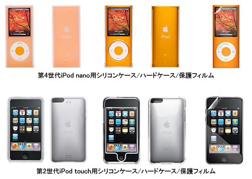 ラインアップは、シリコンケース、ハードケース、保護フィルム。それぞれ第4世代のiPod nano用と第2世代のiPod touch用を用意する。シリコンケースとハードケースともに、ケースを装着したまま基本操作や充電などが行える。