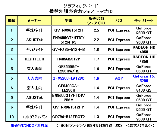 一方グラフィックボードは、1位がギガバイトの「GV-NX96T512H」で2.5%。チップセットがNVIDIA GeForce 9600GT、メモリがGDDR3-512MBのスタンダードモデルだ。銅とアルミニウムでつくった特殊な放熱板を採用したZALMAN製の冷却ファンが発熱を抑える。2位はASUSTeK Computerの「EN9600GT/HTDI/512M R3」で2.2%。大型静音クーラー「Glaciator」を搭載し、強力な放熱能力で安定して動作する。3位はギガバイトの「GV-R485-512H-B」で1.8%だった。売れ筋上位10製品のほとんどがHDCP対応だが、中には非対応の製品もあるので、購入の際には念のためにチェックしておきたい。