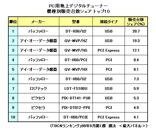 まず、9月第1週(9月1-7日)のPC用地デジチューナー機種別販売台数シェアをチェックしよう。1位はバッファローの「DT-H30/U2」で20.7%。続いて2位はアイ・オー・データ機器の「GV-MVP/HZ」で19.3%だった。いずれもUSB接続の外付けタイプで、ノートPCでも使うことができる。取り付けが簡単なのが初心者にも人気のようだ。
