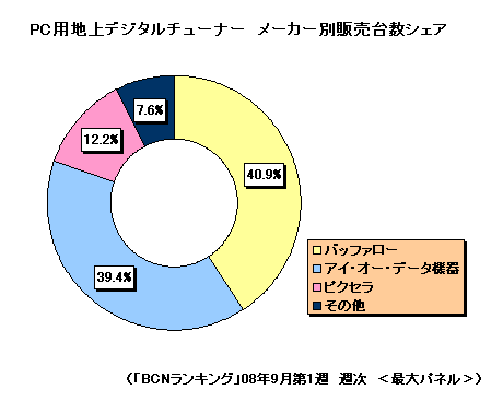 次にメーカー別のシェアを見てみよう。機種別で1位を獲得したバッファローが40.9%で同じくトップ。バッファローの製品はPCへの負担を軽減する「トランスコード機能」を搭載しており、少し古いPCでも地上デジタル放送を視聴・録画できるのが魅力だ。2位は機種別販売台数シェアの1-5位に3製品がランクインしたアイ・オー・データ機器で39.4%。3位はピクセラで12.2%だった。