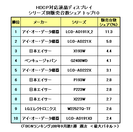 HDCP対応液晶ディスプレイは、1位、2位ともにアイ・オー・データ機器の製品がランクインした。1位は19型ワイド「LCD-AD191X_2」で11.3%。2位は22型ワイド「LCD-AD221X」で5.0%だった。両製品とも、ワイド解像度以外の映像を、縦横比を崩さず画面の端まで拡大する「アスペクト比固定拡大機能」を搭載する。3位は日本エイサーの19型ワイド「X193W」で4.4%。動画や文字といった、映像に最適な表示モードを選べる「Acer eColor Management」機能がウリだ。