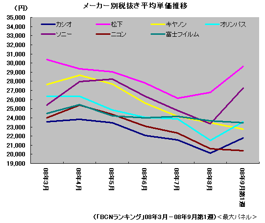 3月から9月1週目までで、コンパクトデジカメ市場全体の平均単価(税抜き、以下同)の推移をみると、4月以降右肩下がりに安くなっていき、8月を底に9月で価格が一気に上昇している。主要メーカー7社(カシオ計算機、松下電器産業、キヤノン、オリンパス、ソニー、ニコン、富士フイルム)の平均単価推移をみても、各社とも春モデルが出揃う3?4月に単価が上昇し、8月を底に9月に入ると再び上昇するパターンを描いている。