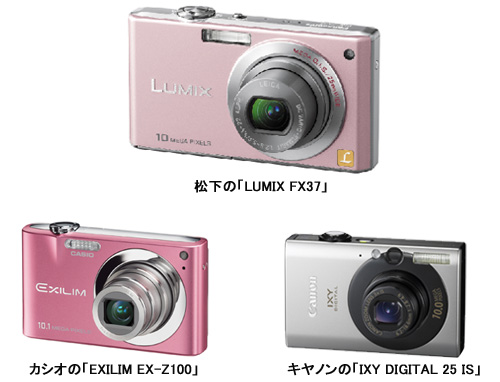 最後に9月1週の販売台数シェアランキングトップ3は、1位が松下の「LUMIX FX37」で6.1%。2位がカシオの「EXILIM EX-Z100」で4.1%、同率2位がキヤノンの「IXY DIGITAL 25 IS」4.1%だった。1位の「LUMIX FX37」は秋冬の新モデル。税抜きで約3万4000円と旧モデルよりも高めだが、新機能として被写体を自動的に追い続けるという「追っかけフォーカス」を搭載しているのがウリだ。