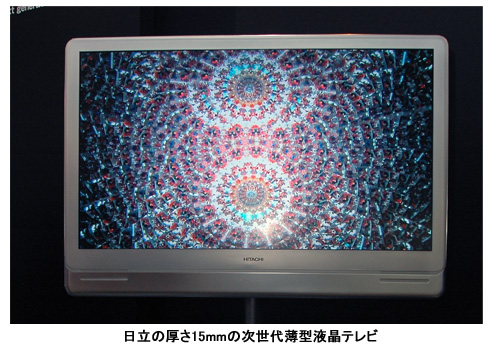 日立製作所は最薄部が15mmでバックライトにLEDを採用した次世代薄型液晶テレビを展示した。サイズは37V型。詳細は「非公開」(日立)だという。また、SDと呼ばれる現行のアナログ放送程度の映像をハイビジョン(HD)画質まで高める技術「超解像度映像信号処理技術」も展示。デモではソフトウェアでHD画質まで高めているが、実用化に向けてアルゴリズムをソフトウェア、ハードウェアで処理にするのかといった詳細はこちらも非公開だという。