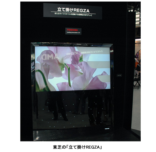 東芝は壁掛けではなく“壁に立て掛ける”液晶テレビ「立て掛けREGZA(レグザ)」を参考出展した。テレビは厚さ48mmのガラス板に上部がディスプレイ、下部にスピーカーを埋め込んだ。スピーカーは背面を向いており、壁に音を反射させることで部屋中に音を広げる。展示されているテレビのサイズは52V型で、HDDも内蔵する。東芝では壁に立て掛けることでスタンドを使った時よりも30%設置面積を削減できるとしている。