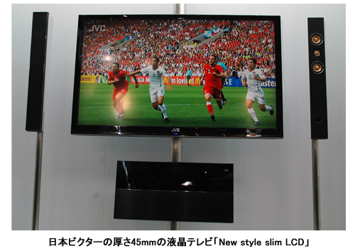 日本ビクターは初公開となる厚さ45mmの液晶テレビ「New style slim LCD」を出展した。サイズは42V型でディスプレイ部とチューナー部を分離した。デモ機ではディスプレイとチューナー部はHDMIで接続しているが、商品化に向けてはHDMIにするか、無線にするかは今後検討するという。ビクターでは来春に欧州で発売をする意向で、国内での発売は未定だという。