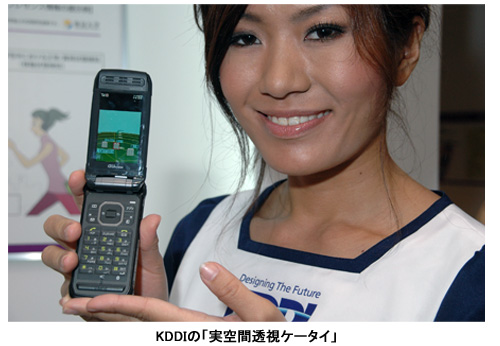 携帯電話ではユニークなインターフェイスや端末の出展が目立った。KDDIは、新インターフェイス「実空間透視ケータイ」を展示した。これは加速度や地磁気など6軸のセンサーを使って端末の方向や傾きを検出し、地図情報と結びつけることで、端末を向けた先に何があるかを表示する技術。新しい地図サービスなどに利用できるという。また、ケータイのカメラ映像をソフトで高速分析することで上下左右など端末を傾けたりするだけで操作できるインターフェイス「直感コントローラー」も紹介した。