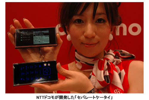NTTドコモはディスプレイとキーを分離した「セパレートケータイ」を出展した。マグネットでディスプレイとキーを縦位置や横位置につなげて使うことができ、ユーザーが好みの形で端末を利用できる。キー部分はハードキー、ソフトキーのどちらにも対応できる。ドコモでは新しい端末の提案として開発したという。実用化は未定。