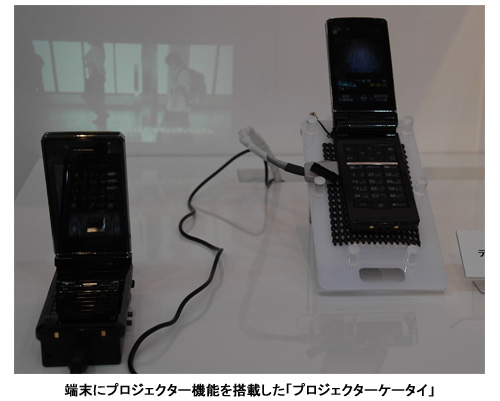 また、プロジェクターを搭載した「プロジェクターケータイ」も展示した。端末のキー部分の背面にDLP対応のプロジェクターモジュールを搭載しており、最大で50インチのサイズまで映像を表示できるという。デモでは一番キレイに映像が楽しめるという32インチの画面サイズで映像を表示した。実用化に向けてはプロジェクター部分の小型化と消費電力の削減が課題だという。