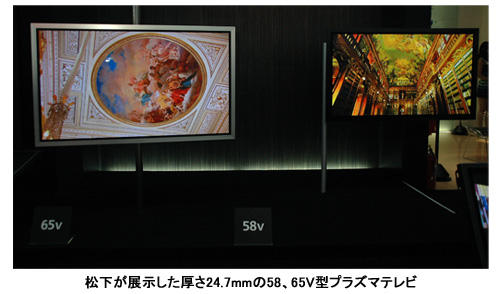パナソニックは24.7mmの超薄型テレビを展示。パナソニックではこれまで同じ厚さの50V型はすでに発表しているが、今回は58、65V型と大型のモデルを開発した。同時に3次元(3D)システムを搭載したプラズマディスプレイと、フルHDの3D映像をリアルタイムに再生できるブルーレイディスク(BD)プレーヤーで構成するシステム「3DフルHDプラズマ・シアターシステム」も出展。デモコーナーには長い行列ができた。