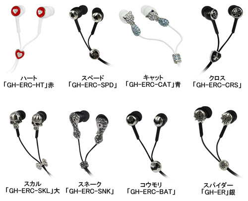 「GH-ERC-HT」は、イヤホン部の中央にハート型のクリスタルを飾り付けた。カラーは黒と赤の2色。「GH-ERC-SPD」は、中央に黒いスペードを描いた。カラーは銀。蝶ネクタイをした猫をかたどった「GH-ERC-CAT」は、表面に細かいクリスタルを施した。カラーは銀、青、桃の3色。「GH-ERC-CRS」は、中央にクロスを描いた。カラーは黒。