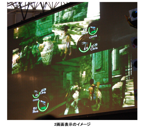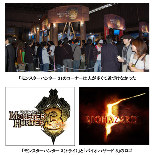 カプコンブースで、もっとも注目度が高かったのはWii用に発売するハンティングアクションゲーム「モンスターハンター 3(トライ)」だった。カプコンブースに行ってみると、開場から2時間ですでに長蛇の列。試遊台に近づくどころか、人垣で遠目から見ることもできず、あえなく断念した。代わりにサバイバルホラーゲーム「バイオハザード」の新作、「バイオハザード 5」のコーナーを覗いてみた。