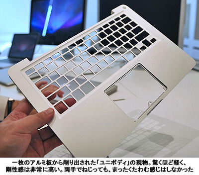 まず、何といっても目を引くのが、新しいMacBookとMacBook Proデザインだ。キーボード部分を覆うトップカバーから側面にかけては、まったく継ぎ目がない一体化されたアルミになっている。これは、一枚のアルミの板から削り出されたもの。アップルではこのボディーを「ユニボディー」と呼んでいる。