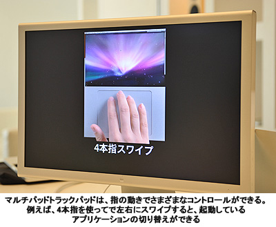 MacBookとMacBook Proでは、この操作がさらに進化して、3本指や4本指で操作することでアプリケーションを切り替えたり、Exposeを利用したりすることができるようになった。指の動きだけで、こうしたさまざまな操作ができるようになったことから、アップルでは、MacBookとMacBook Proが搭載するトラックパッドを「マルチパッドトラックパッド」と呼んでいる。