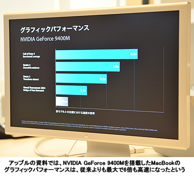 この9400Mは、オンボード上の統合型グラフィックプロセッサとしてMacBookとMacBook Proに搭載されている。ノートPC向けに新開発されたGPUで、アップルが初めて採用したものだ。サイズが小さく、発熱や電力消費を抑えながら、高いパフォーマンスを発揮する。従来のMacBookと比べると、新しいMacBookのグラフィック性能は5倍のパフォーマンスを達成しているという。