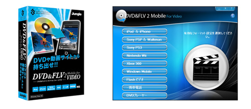 「DVD&FLV2MobileForVideo」は、DVDの動画やYouTube/ニコニコ動画などのインターネット上にある動画を、iPodやウォークマンなどの携帯オーディオで再生できる形式ファイルに、ワンクリックで変換できる動画変換ソフト。YouTube、ニコニコ動画などの動画投稿サイトのURLをコピー&ペーストするだけで、FLVファイルを抽出できる。対応出力デバイスは、iPodシリーズ、iPhone、PSP、Sony Walkman、PS3など。