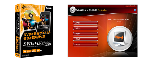 「DVD&FLV2MobileForAudio」は、DVDの動画やインターネット上にある動画から「音声」だけを抽出し、MPEG4 AAC/MP3などに変換できる音声変換ソフト。「DVD&FLV2MobileForVideo」と同様、ワンクリックの変換作業、URLからのFLVファイルの抽出機能を搭載するほか、オーディオビットレートの指定や出力ファイル名称のルール設定、ID3タグ付加などのオーディオ出力設定に対応する。出力フォーマットはMPEG4 AAC/MP3/WMA/OggVorbis/WAV。