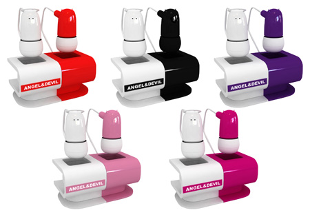 片方のイヤホン部に頭上に輪を乗せた天使のキャラクターをあしらい、もう片方に角が生えた悪魔のキャラクターをあしらったイヤホン。使用しない時に飾っておけるスタンドと、S/M/Lサイズのシリコンイヤーピースが付属する。