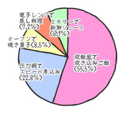 4位は「電子レンジで蒸し料理」で7.2%でした。蒸し料理は油を使わず、調味料と食材の水分だけで調理できるので、とってもヘルシーです。最近では、レンジ用の蒸し調理器も人気のようです。健康維持やダイエットのために活用してみては?