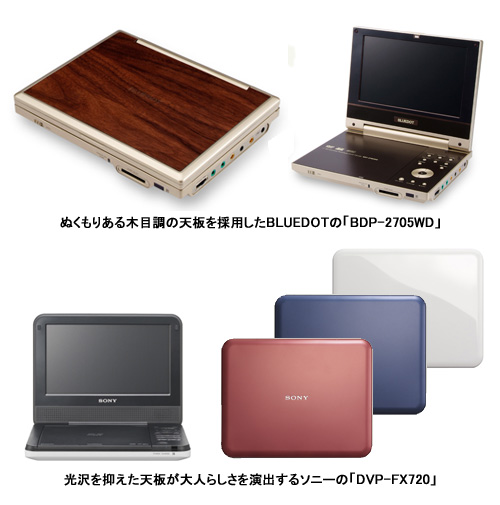 ポータブルDVDプレーヤーでいま注目したいのは、カラーバリエーション。例えば、BLUEDOTの「BDP-1725」は、シャンパンゴールド、ゴールド、グレーといった高級感ある色のモデル。同じくBLUEDOTの新モデル「BDP-2705WD」は木目調の天板を採用する。ステーショナリーを思わせる、ぬくもりのあるデザインだ。また、ソニーの「DVP-FX720」は光沢を抑えたブルー、レッド、ホワイトの大人っぽい天板カラーが目を引く。